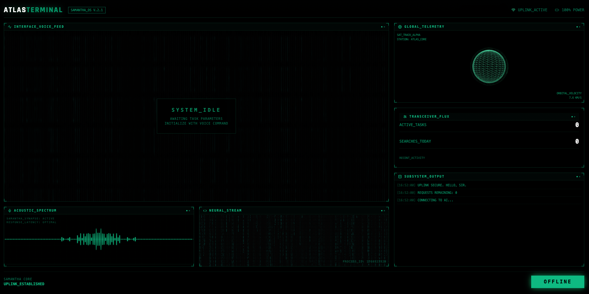 The complete Atlas Terminal interface featuring voice feed, telemetry, task monitoring, and neural stream panels.